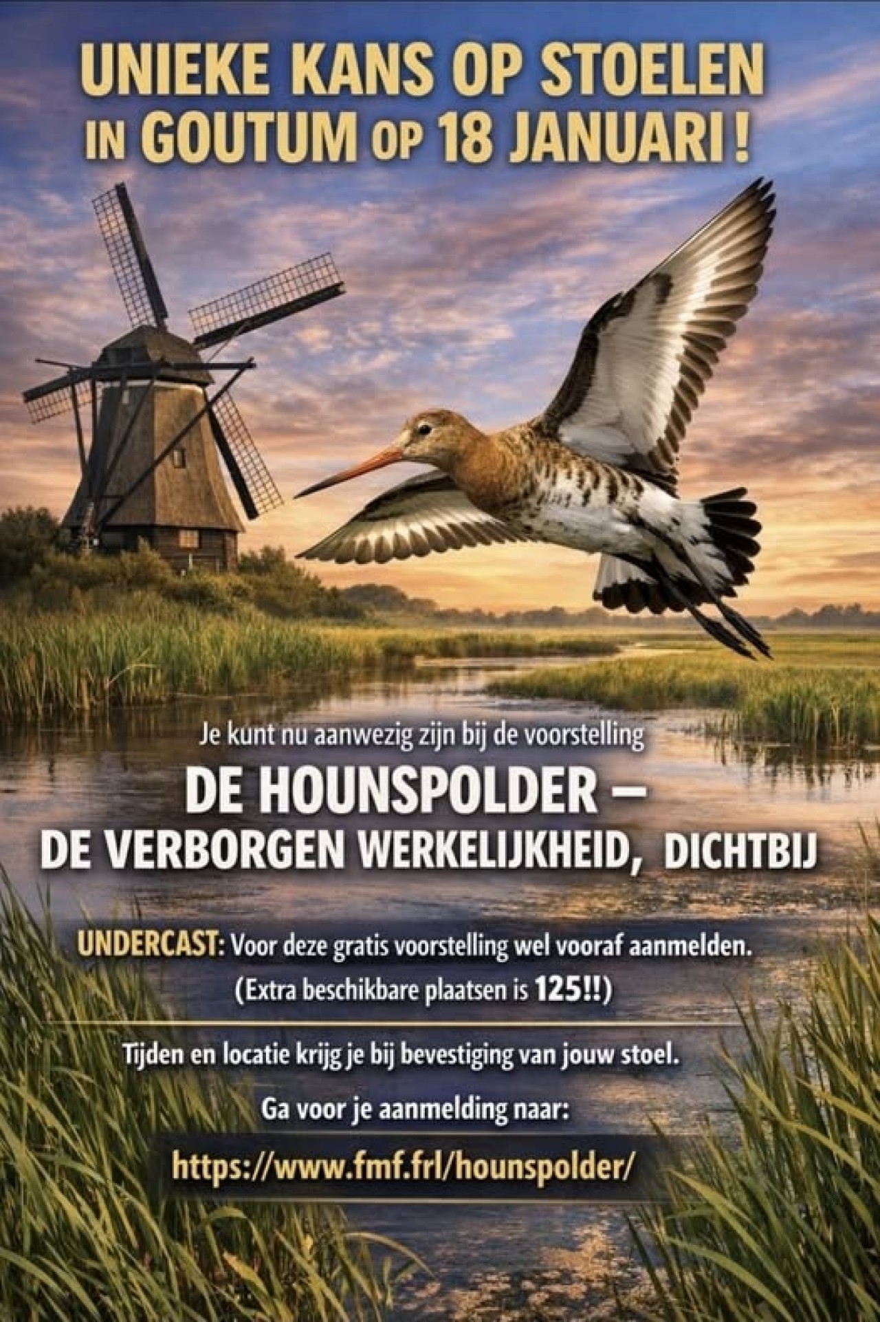 Zondagmiddag staat Goutum in het teken van de Hounspolder. De natuurdocumentaire "De Hounspolder - de verborgen werkelijkheid, dichtbij" is dan opnieuw te zien op het grote doek.