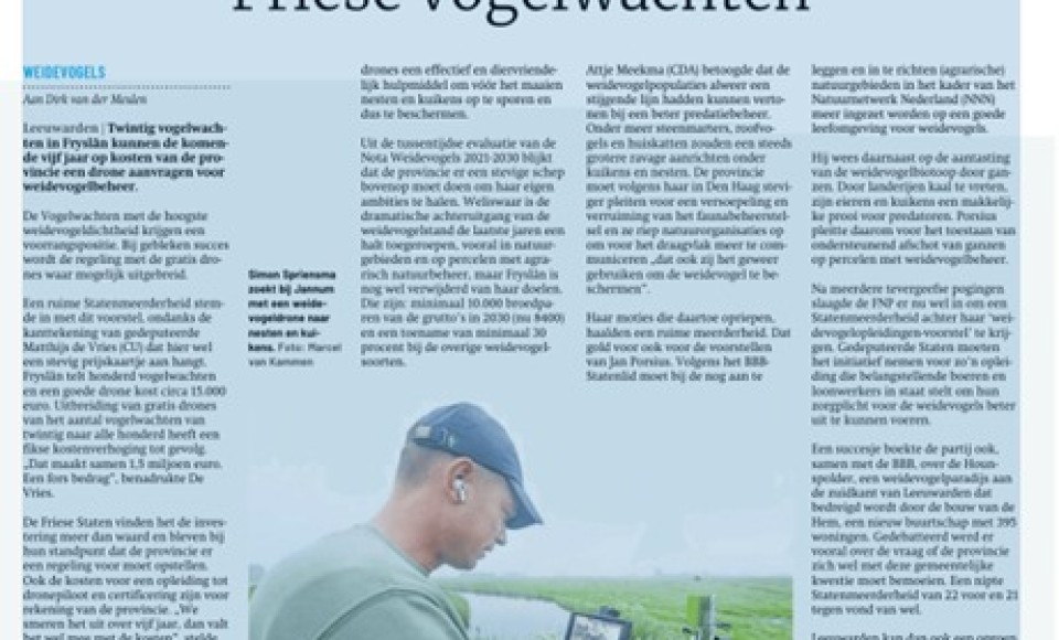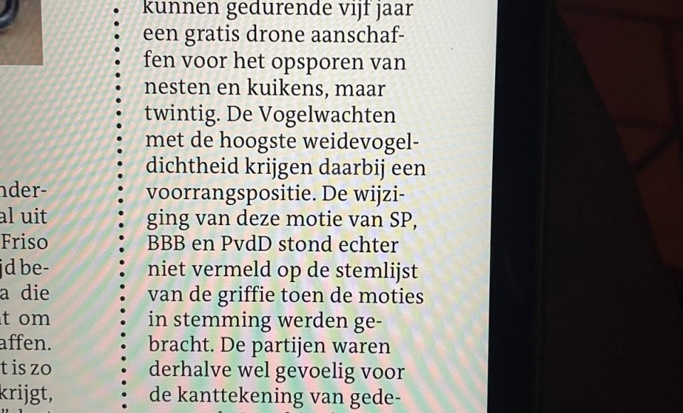 De meest opvallende motie? Het gratis beschikbaar stellen van drones voor vogelwachten. Een prachtig, maar kostbaar initiatief. Daarom start het met twintig vogelwachten, waarbij gebieden met veel weidevogels voorrang krijgen. Bij succes volgt uitbreiding.