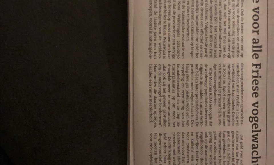Daarom zijn er meerdere moties aangenomen. Zo wil men bij nieuwe natuur meer aandacht voor leefgebied van weidevogels en komt er een opleiding voor boeren en loonwerkers. Ook kreeg de FNP steun voor extra bescherming van de wulp. Hiervoor zal de BFVW binnenkort een voorstel indienen bij de provincie.