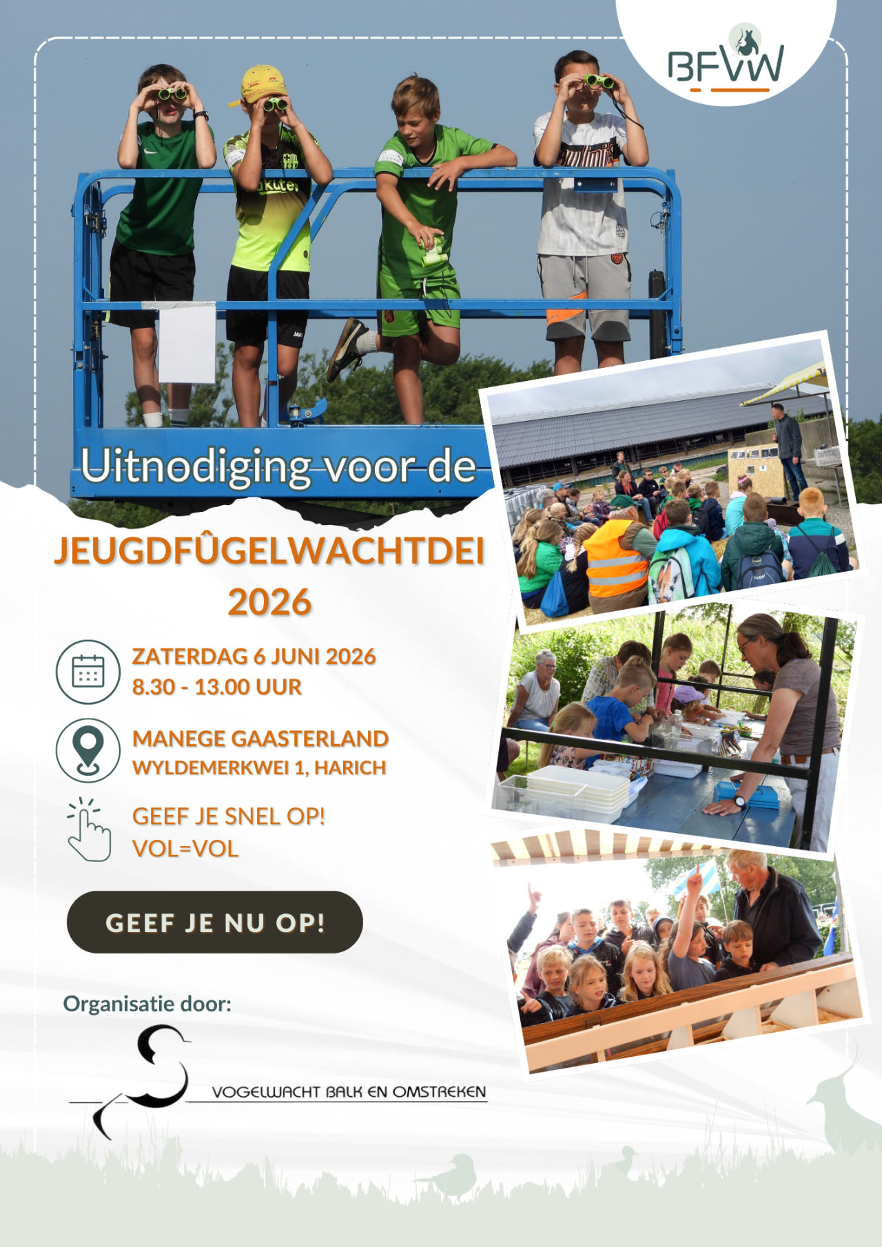 Zaterdag 6 juni is het weer zover: dé dag waarop kinderen de natuur van dichtbij kunnen beleven! Van 8.30 tot 13.00 uur organiseren we, in samenwerking met vogelwacht Balk en omstreken, bij Manege Gaasterland een sprankelende en leerzame Jeugdfûgelwachtdei.