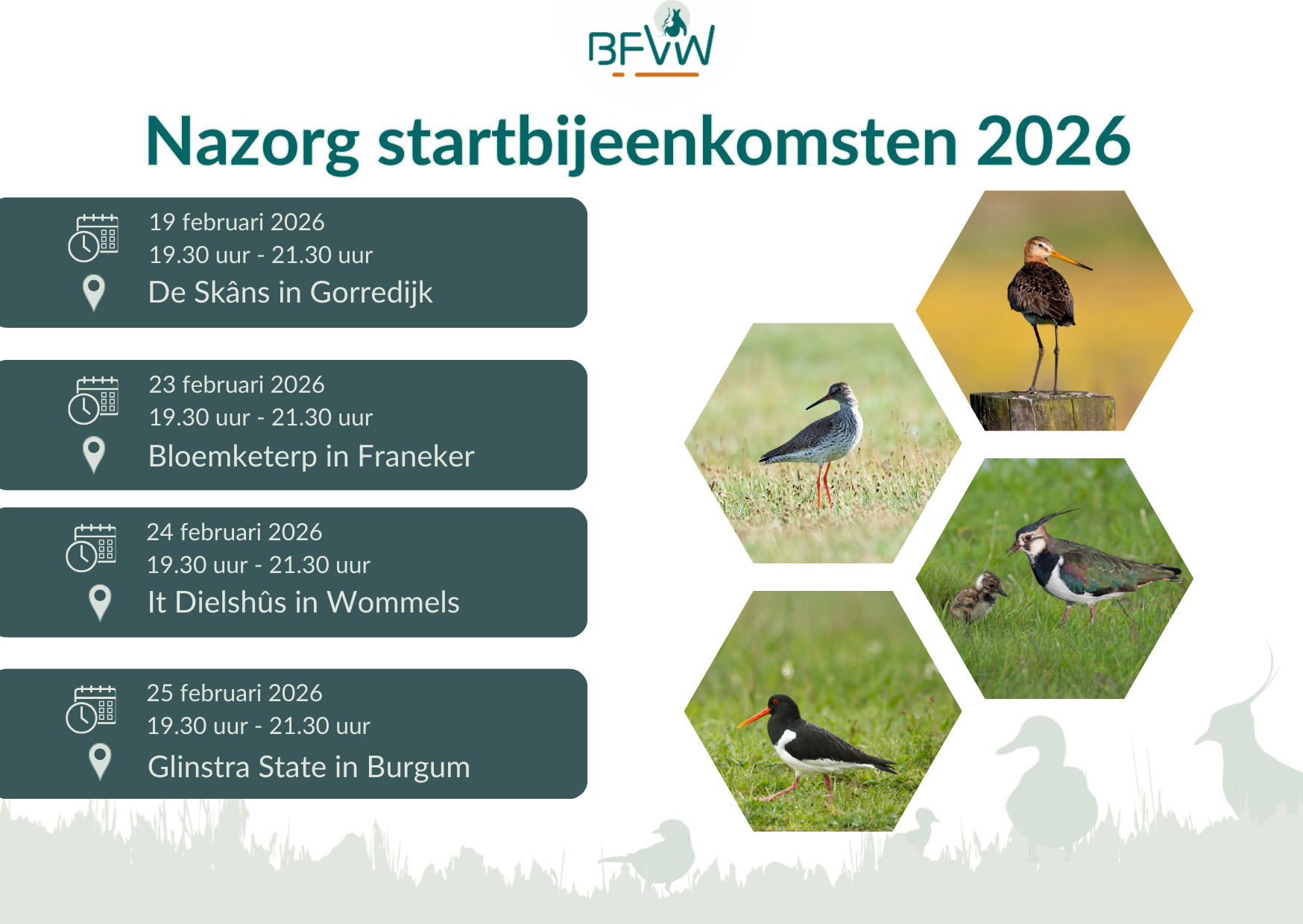 Op de avond zullen verder de update van de BFVW-app (neem je mobieltje mee!), het Stimuleringsfonds Boerenlandvogels Fryslân 2026 en het project Grutsk op ús Greidefûgels aan de orde komen.