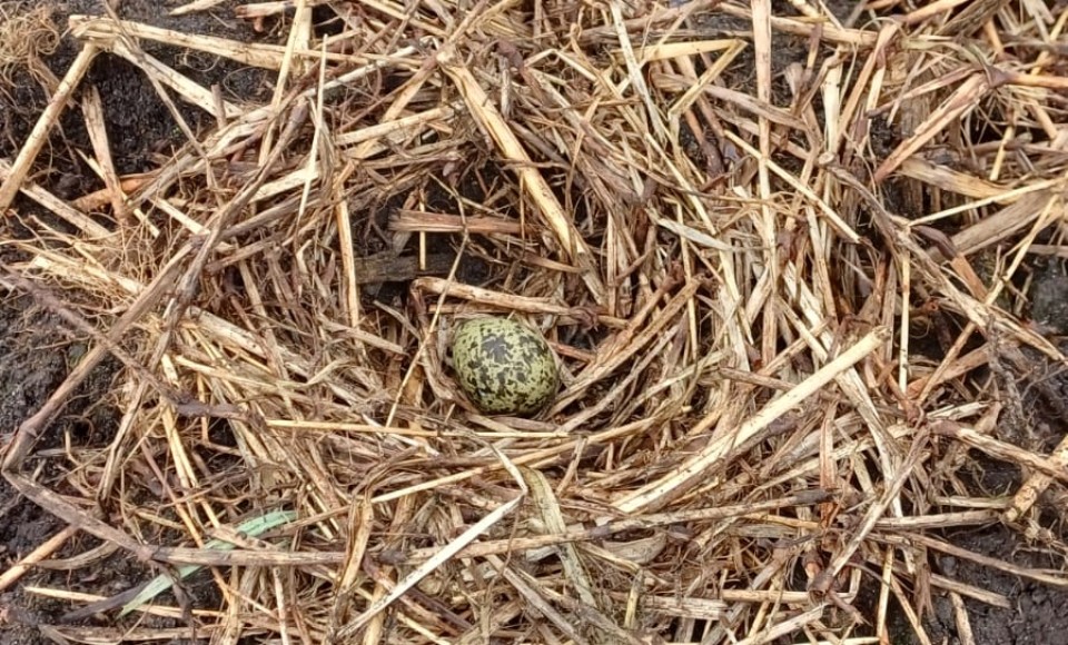 Het is vrij mistig op de ochtend van zaterdag 7 maart. Dat weerhoudt de echte aaisikers er natuurlijk niet van om toch een kansje te wagen. "Mar", zegt Wietse Jan Dijkstra (49, St. Anneparochie), "mei dit waar kinne je it net op'e fûgels dwaan, fansels". Dat betekent dus dat hij kansjes, die hij in de afgelopen dagen al gezien had, bij langs gaat. "En dan moat je wat mear yn'e benen". Mistig of niet, dit nest was echt niet te missen, het kievitspaar had een prachtig opgemaakte wieg gemaakt voor hun ei.